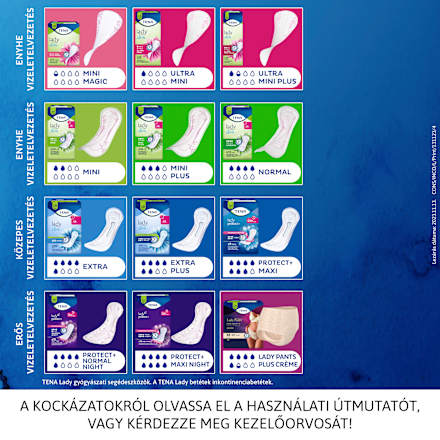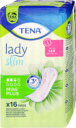 A Tena Lady Slim Mini Plus inkontinencia betét háromszoros védelmet kínál a szivárgás, a kellemetlen szagok és a nedvesség ellen. A betétek egyedülálló biztonságot nyújtanak enyhe és középsúlyos vizelettartási problémák, alkalmi vizeletcsepegés esetére. Biztosítják a gyors nedvszívást és az azonnali megnyugatató száraz érzést. Méretre megegyezik egy kisebb egészségügyi betéttel, nedvszívó ereje azonban a microPROTEX™ kompressziós technológiának köszönhetően jóval meghaladja azokét. Azonnal magába zárja a szagokat is a Fresh Odour Control szagsemlegesítő rendszer miatt, ezzel minimálisra csökkenti az inkontinencia mindennapi életet megkeserítő hatását. Karcsú, asszimetrikus, hosszított kivitele puhán követi a test vonalát, egyetlen testhelyzetben - akár sportoláskor - sem fog csalódást okozni. Dobozában egyenkénti csomagolásban található, így higiénikusan, akár zsebébe csúsztatva is magával viheti. Élete során nagyon sok embernek okoz gondot az inkontinencia, a Tena betétek azonban visszaadják a magabiztosságot, a megnyugtató komfortérzetet. Próbálja ki a Tena termékcsalád többi tagját is, találja meg az Ön igényeinek legmegfelelőbbet. A dm Online Shopjában válogasson kedvére, gyorsan és diszkréten megvásárolhatja ezeket a kiváló, magas minőségű termékeket!